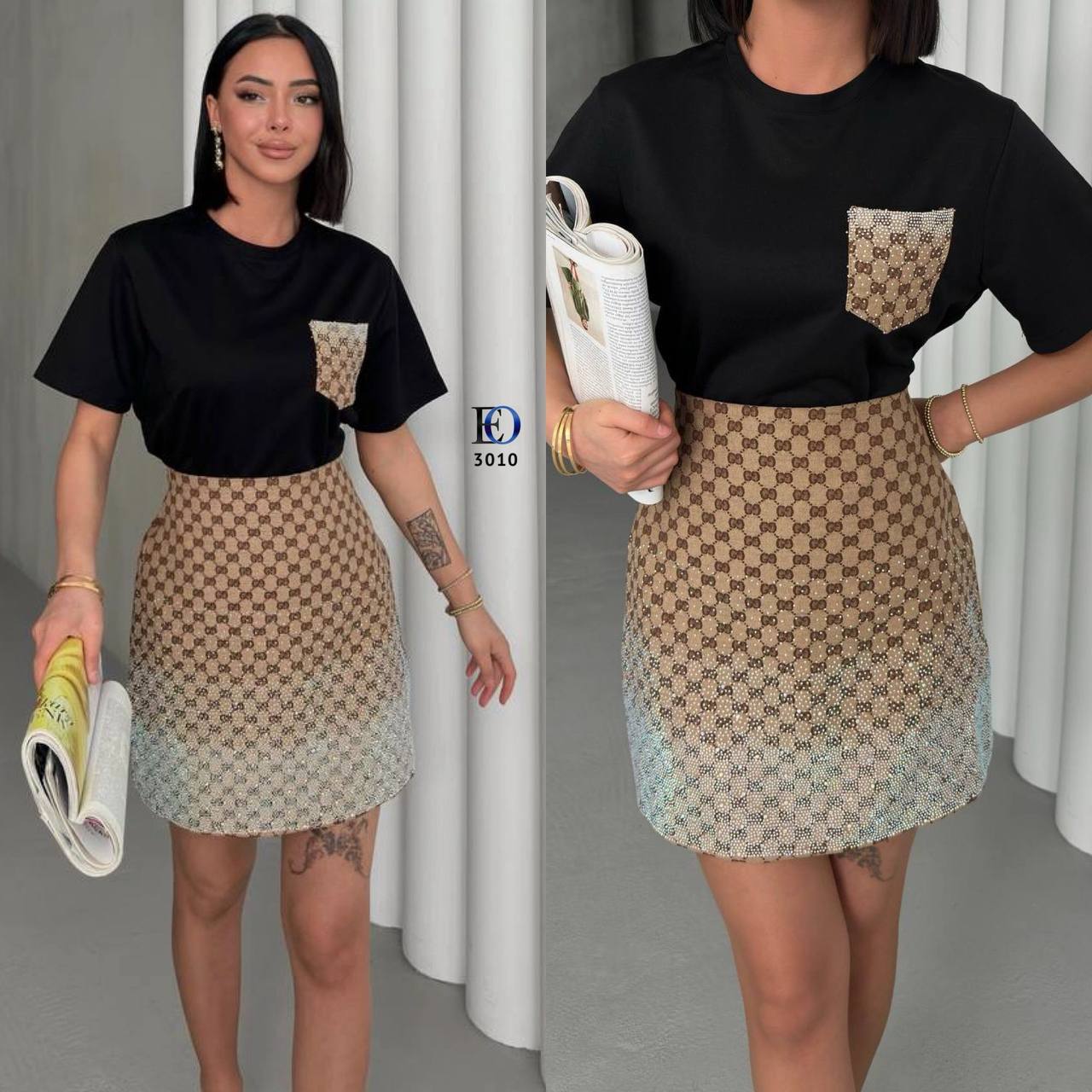 Το **Gucci MonogramSet Beige** είναι ένα elegant σετ που περιλαμβάνει φούστα και σακάκι, διακοσμημένα με το χαρακτηριστικό μοτίβο GG. Κατασκευασμένο από ύφασμα υψηλής ποιότητας, με δερμάτινες λεπτομέρειες και άψογη εφαρμογή, αυτό το σετ αποπνέει πολυτέλεια και κλασικό στυλ. Ιδανικό για chic εμφανίσεις από το πρωί έως το βράδυ.